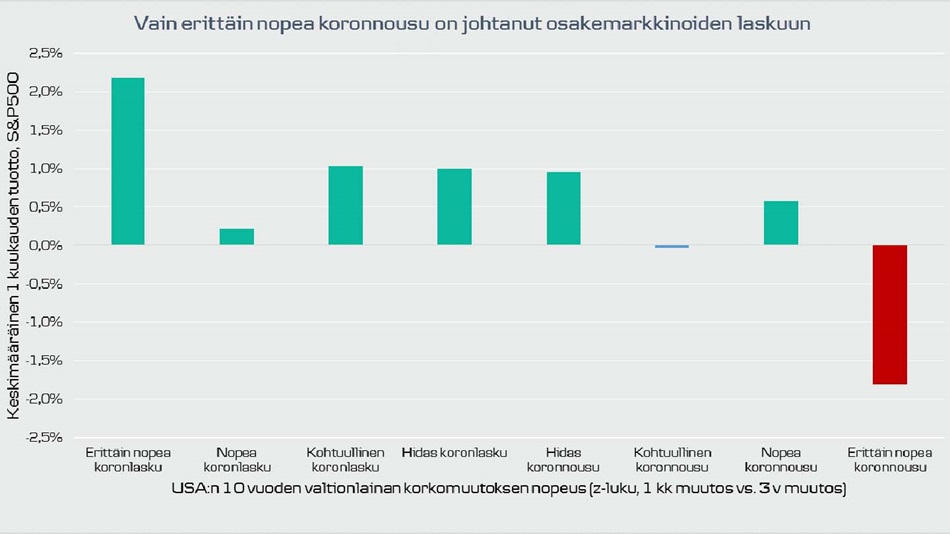 Toiseksi, korkojen nousun nopeudella on yhä merkitystä. Kuva 2 näyttää kuinka osakkeet ovat tuottaneet keskimäärin kuukauden aikana kun samaan aikaan korot ovat liikkuneet eri tavoin. Laskevat korot johtavat yleensä osakkeiden nousuun, eikä laskuvauhdilla ole tässä merkitystä. Korkojen noustessa, osakkeet pystyvät yleensä sopeutumaan tilanteeseen jos nousu on maltillista. Mutta siinä tapauksessa jos korot nousevat nopeasti, osakkeet keskimäärin laskevat saman kuukauden aikana. Tätä laskua on selitetty sillä, että korko-odotukset olivat olleet liian matalia ja siksi osakkeiden hinnat olivat olleet liian korkeita.