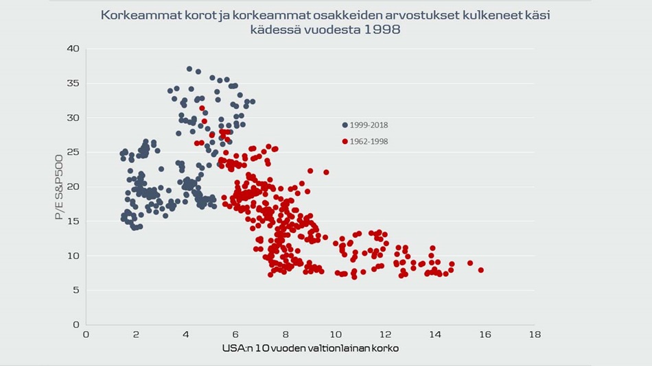 Kuva 1 kartoittaa S&P 500 -indeksin P/E-luvut ja vastaavat Yhdysvaltojen 10 vuoden valtionlainan korot vuodesta 1962 alkaen. Nämä pisteet on kuitenkin jaettu kahteen ryhmään: ennen 1998 vuotta ajoittuneisiin ja sen jälkeen tapahtuneisiin. Ennen vuotta 1998yllä mainittu periaate näyttäisi pitävän: korkeammat korot yhdistyvät usein alhaisempiin arvostustasoihin. Kuitenkin viimeiset 20 vuotta kertovat toisenlaista tarinaa: korkeammat korot esiintyvät suurimmaksi osaksi samaan aikaan korkeampien arvostustasojen kanssa.