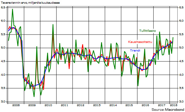 Samaan aikaan tuonti nousi 3 prosenttia eli liki 5,6 miljardiin. Kokonaisuudessaan tavaraviennin arvo on kasvanut ensimmäisen neljänneksen aikana 6 prosenttia. Viennin laskua verrattuna vuoden takaiseen selittää lähinnä vuosi sitten viety laiva. Viennin lukua ei silti voi pitää erityisen vahvana, sillä vaikka vienti Saksaan kasvoi jyrkästi henkilöautoviennin kasvun ansiosta, niin vienti kaikkiin muihin suurimpiin kauppakumppanimaihin laski Tullin mukaan hieman. Kausitasoitettuna vienti oli karkeasti likimain helmikuun tasolla. Tuonnin nousuun vaikutti mm. raakaöljyn kallistuminen.