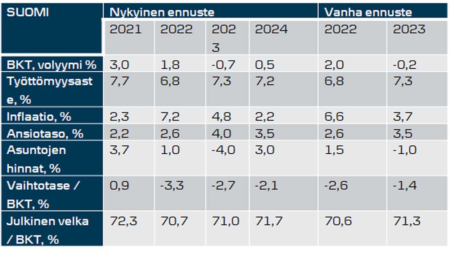 Suomen bruttokansantuote supistui kolmannella neljänneksellä, ja energiakriisi koettelee sekä kotitalouksia että yrityksiä talven aikana. Viennin näkymät ovat heikentyneet syksyn aikana. Danske Bank laskee maltillisesti ennustettaan ensi vuoden talouskasvusta. Nyt pankki ennustaa talouden supistuvan 0,7 prosenttia vuonna 2023. Vuodelle 2024 pankki ennustaa 0,5 prosentin kasvua.