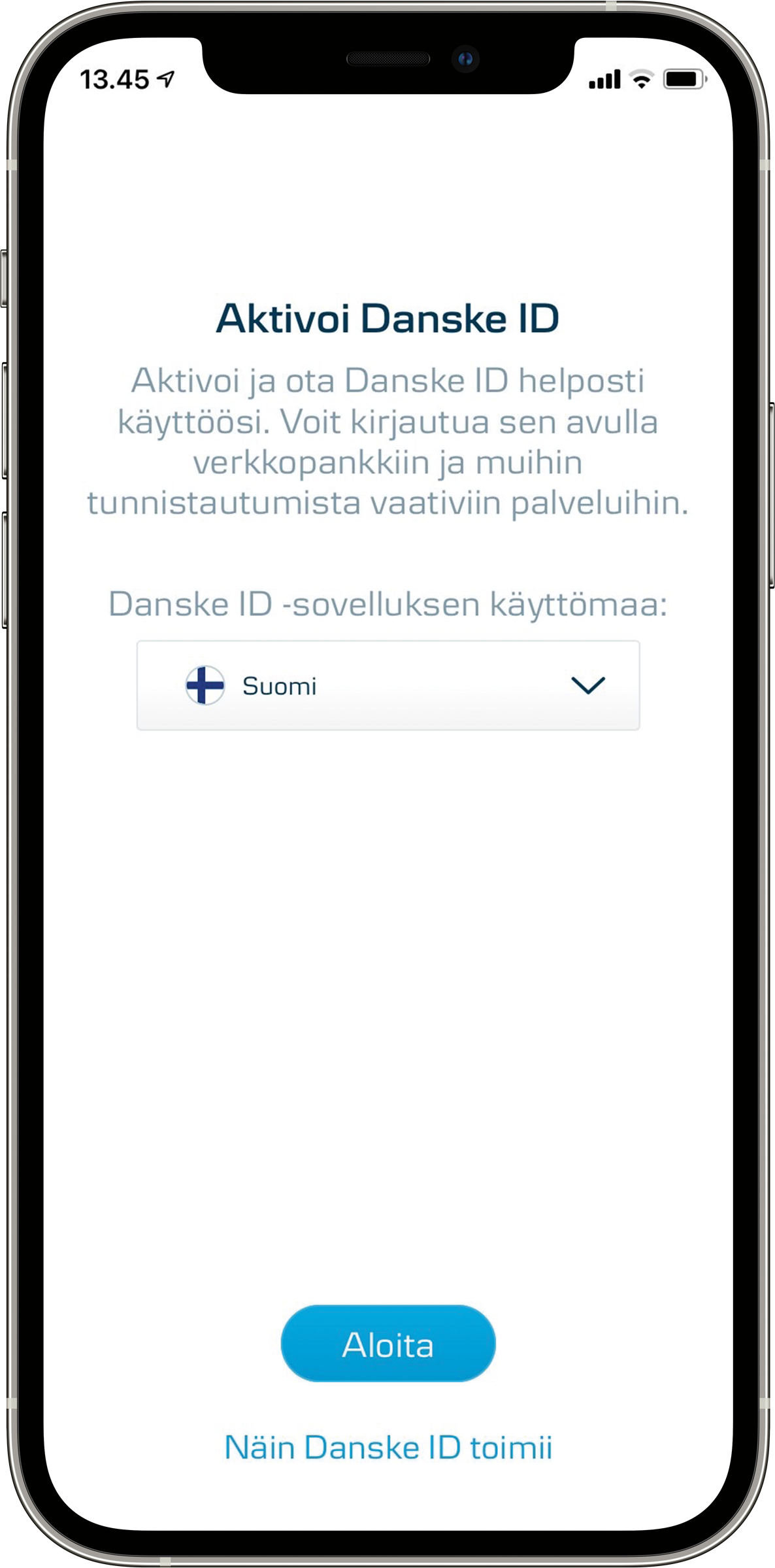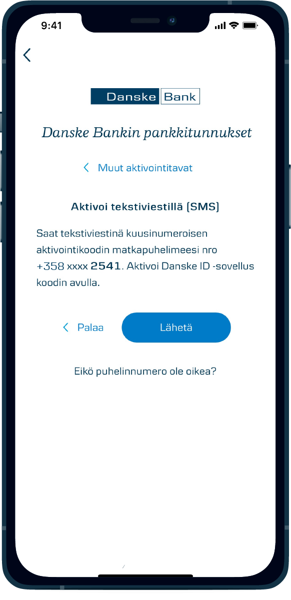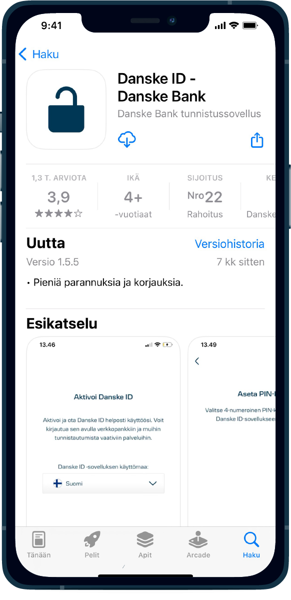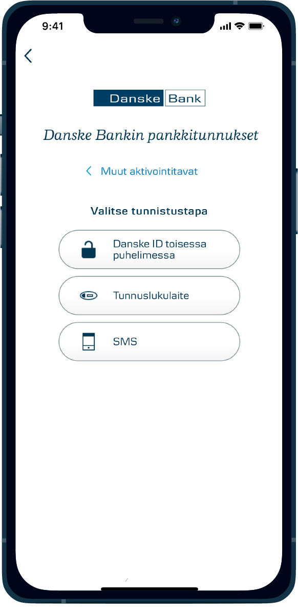 Voit hyväksyä Danske ID -tunnistussovelluksella kirjautumisen mobiili- ja verkkopankkiin, tunnistautua puhelinpalveluumme sekä hyväksyä verkkomaksuja ja tunnistautua kolmannen osapuolen — kuten Verohallinnon tai Kansaneläkelaitoksen — palveluihin. Danske ID toimii myös yrityksen District-verkkopankissa.