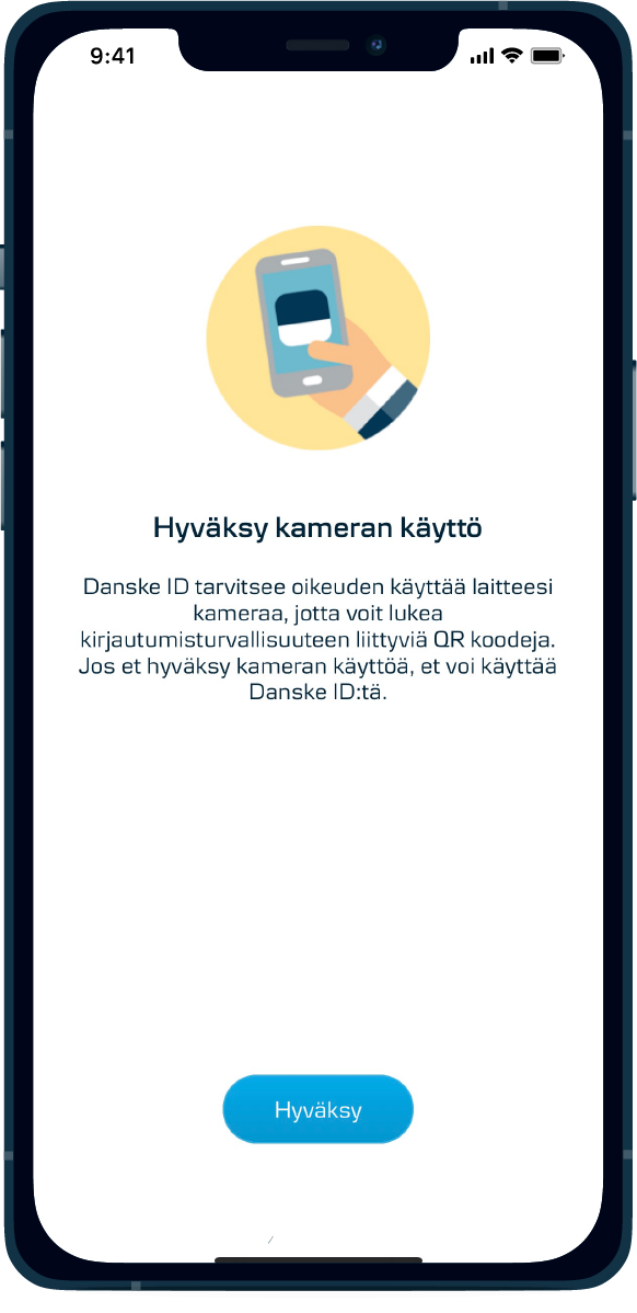 - Avaa mobiililaitteessasi oleva Danske ID -sovellus ja kirjaudu kasvojentunnistuksella, sormenjälkitunnistuksella tai omalla PIN-koodillasi. Kohdista laitteesi kamera kirjautumissivulla näkyvään QR-koodiin.