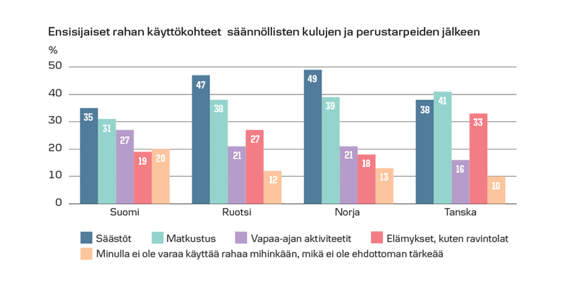 Suomalaisten harkitsevuus rahankäyttäjinä näkyy myös säästämishalukuutena. Säännöllisten kulujen ja perustarpeiden tyydyttämisen jälkeen suomalaiset mieluiten säästäisivät ylimääräiset rahansa – 35 % ilmoittaa tekevänsä näin. Säästämisen jälkeen suosituimpia rahankäytön kohteita ovat matkustaminen ja vapaa-ajan aktiviteetit. Tulokset ovat muissa pohjoismaissa hyvin samansuuntaiset. Säästäminen ja matkustaminen ovat kaikissa maissa suosituimmat rahankäytön kohteet pakollisten menojen jälkeen, joskin Ruotsissa ja Norjassa säästämisen valitsee selvästi suurempi osuus ihmisistä kuin Suomessa.