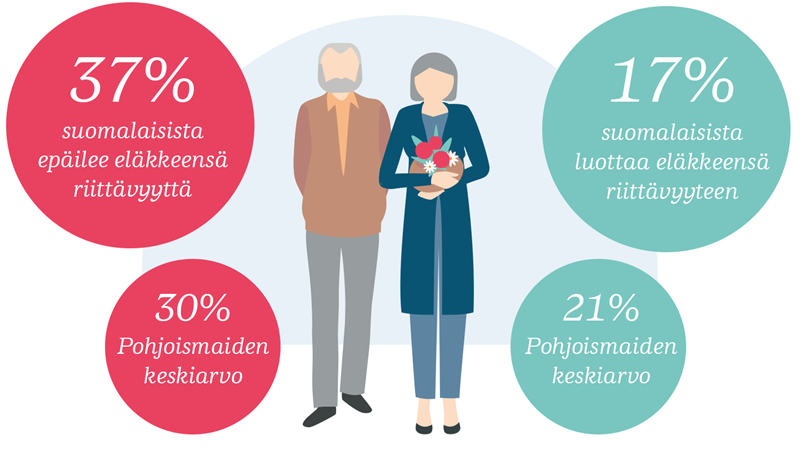 Suomalaiset odottavat jäävänsä eläkkeelle keskimäärin 67,7-vuotiaina, kun muissa Pohjoismaissa odotetaan oman työuran kestävän lähes vuoden pidempään, 68,5 ikävuoteen asti. Suomalaiset myös haluaisivat jäädä eläkkeelle muita pohjoismaalaisia aikaisemmin. Suomalaisten toivoma eläkeikä on 62,9 vuotta, kun muissa Pohjoismaissa toiveena olisi työskentely 1,5 vuotta pidempään.