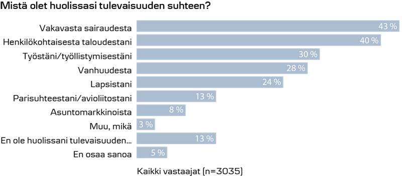 Selvästi eniten huolettavat vakavat sairaudet, josta jopa 43 % ilmoitti olevansa huolissaan. Myös henkilökohtainen talous huoletti jopa 40 % suomalaisista. Suomalaiset ovatkin muita pohjoismaalaisia huolestuneempia taloudestaan, sillä Tanskassa, Ruotsissa ja Norjassa vain vajaa kolmannes on huolissaan henkilökohtaisesta taloudestaan.