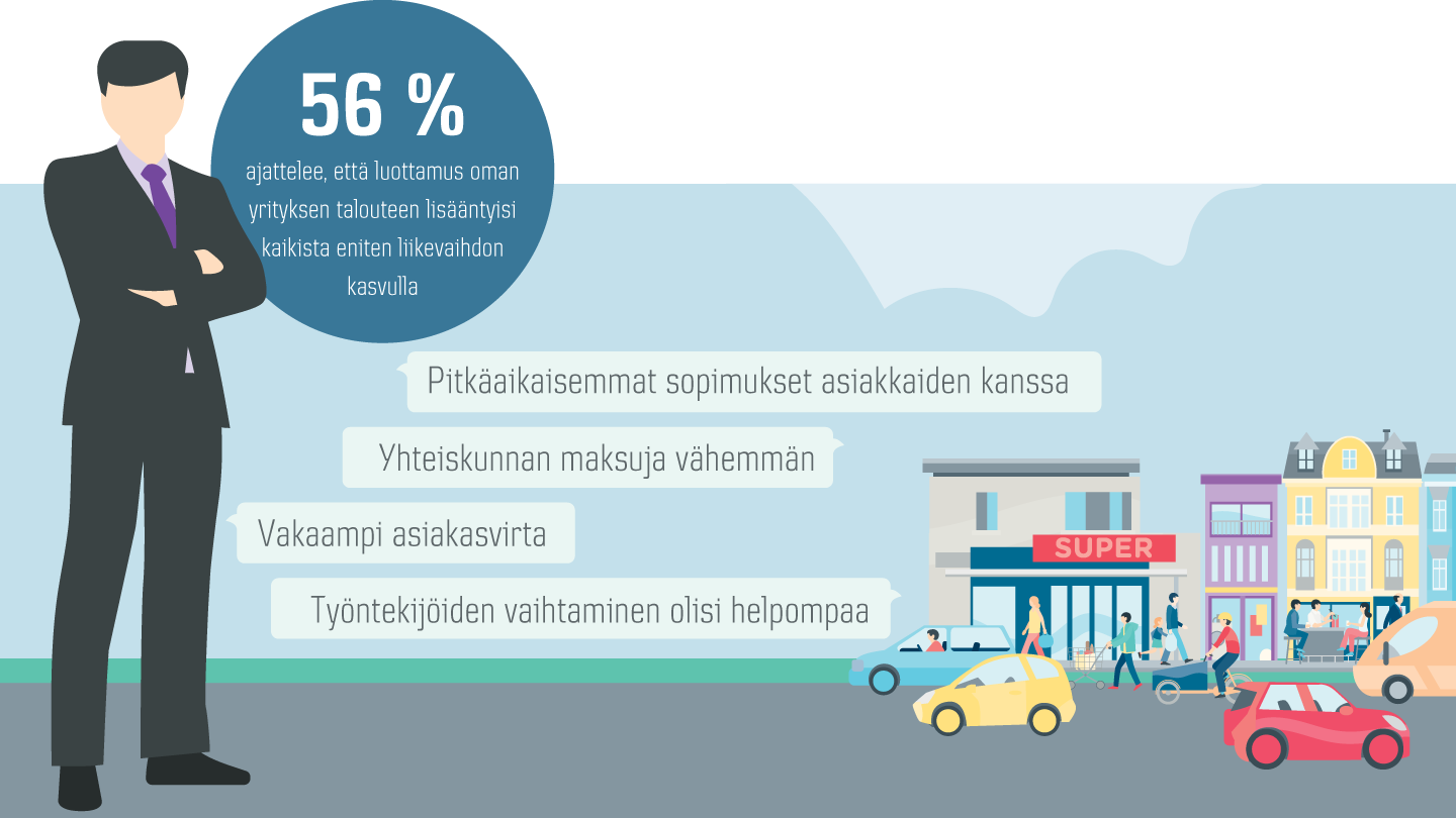 Luottamus oman yrityksen talouteen lisääntyisi kyselyyn vastanneiden mielestä kaikkein eniten liikevaihdon kasvulla; 56 prosenttia ilmoitti tämän tärkeäksi tekijäksi. Muita taloudellista luottamusta nostattavia seikkoja olivat esimerkiksi pitkäaikaisemmat sopimukset asiakkaiden kanssa, vakaampi asiakasvirta ja työntekijöiden helpompi vaihtaminen.
