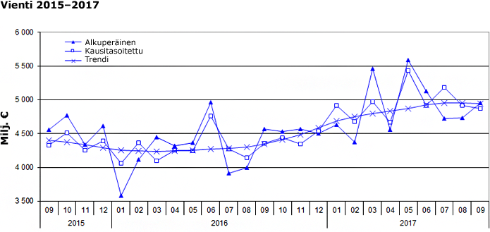 Tavaravienti Yhdysvaltoihin ja Isoon-Britanniaan laski, mutta kasvoi muihin tärkeisiin kauppakumppanimaihin syyskuussa. Kasvua kertyi edelleen laajasti eri tavararyhmistä. Henkilöautojen vienti nousi tuttuun tapaan voimakkaasti Uudenkaupungin autotehtaan kirittäessä kasvua. Pientä laskua tilastoitiin paperin ja pahvin, muovien sekä kojeiden ja mittareiden viennissä. Vaikka vienti ylittää vuoden takaiset lukemat selvästi, viennin trendinousu on taittunut hieman. Kausitasoitettuna syyskuun vienti oli elokuuta vähäisempää.